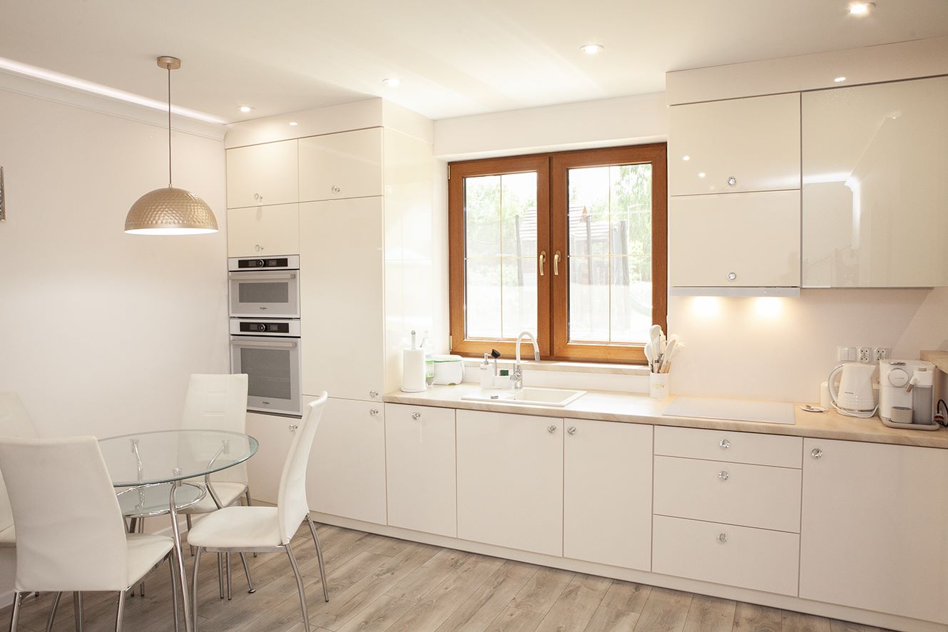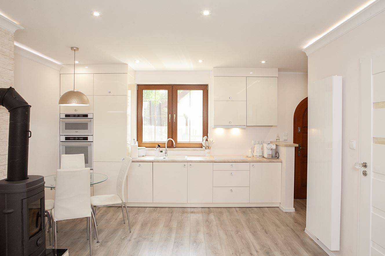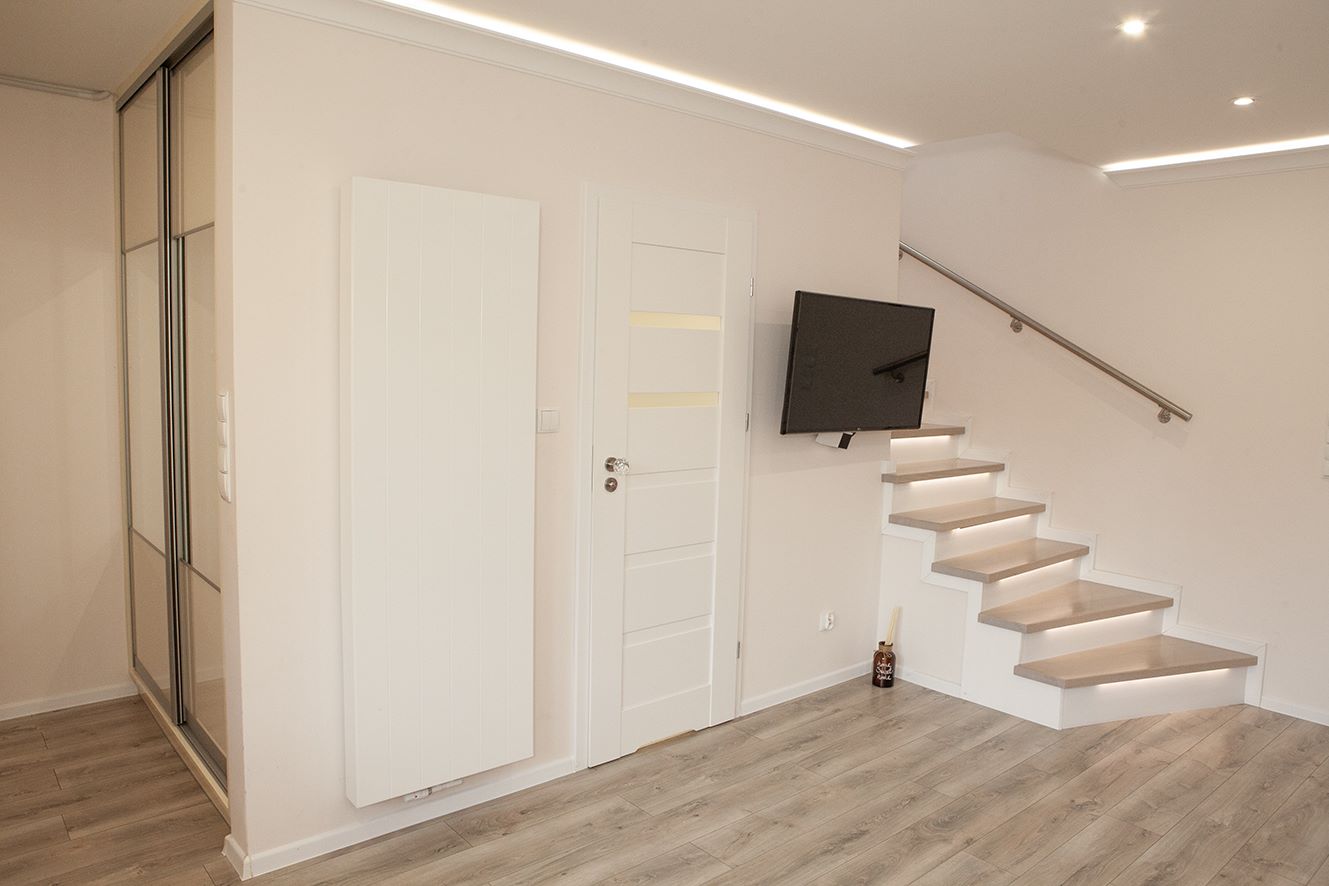 Otwarta przestrzeń na parterze łącząca kuchnie z salonem tworzy efekt przestrzeni i lekkości pomieszczenia. Praktyczna zabudowana szafa przy wejściu pomieści wszystkie walizki i zimowe kurtki.