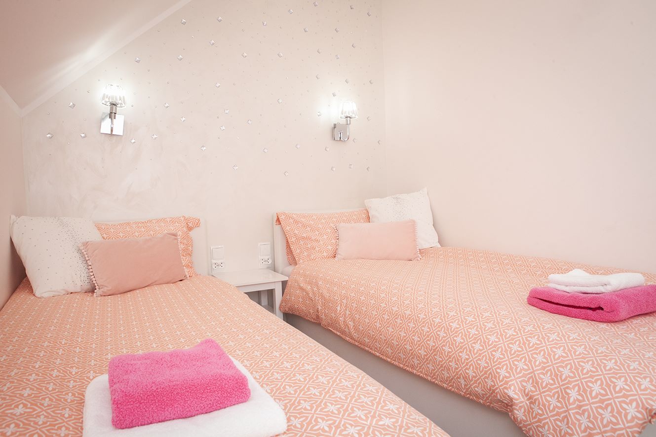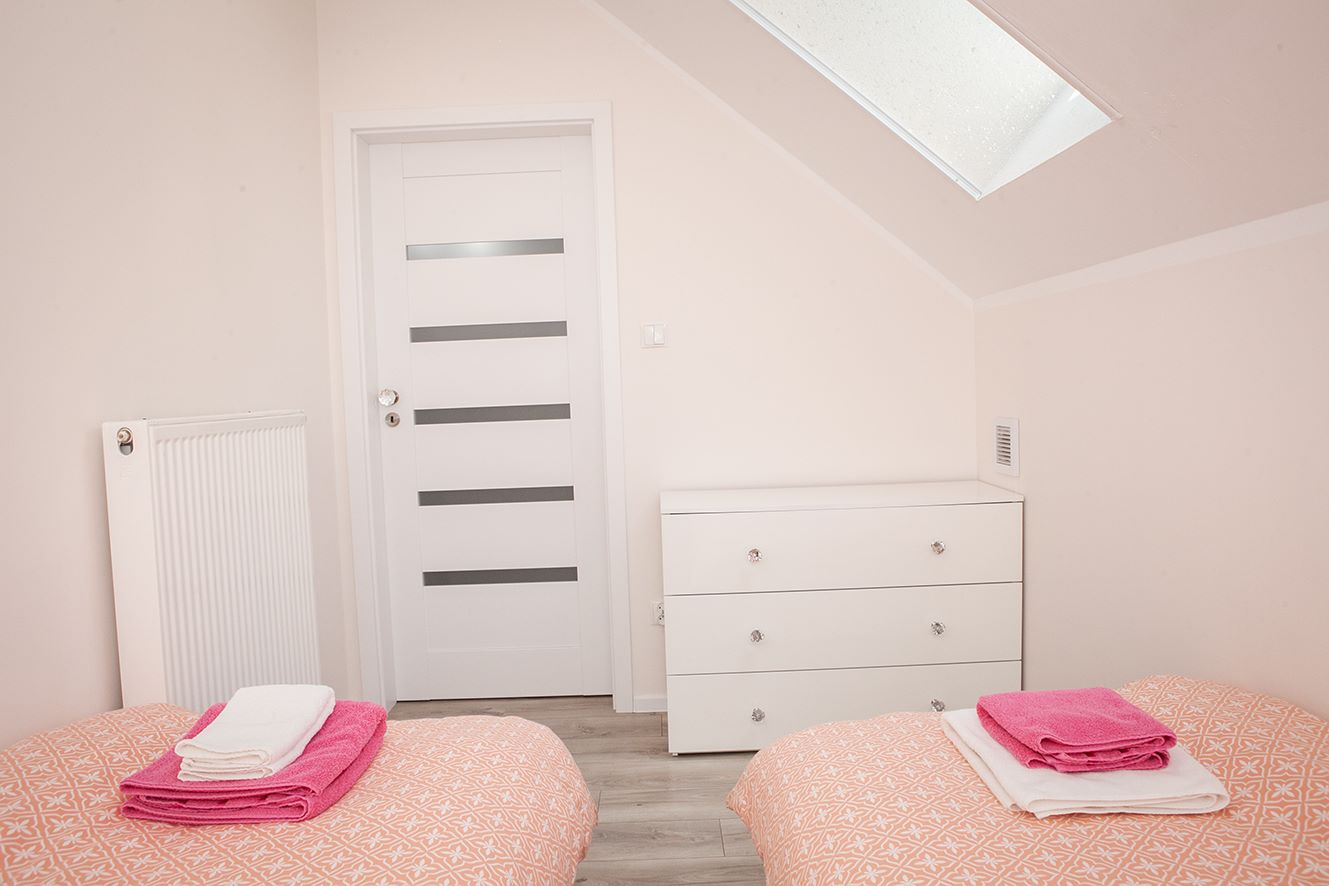 - Sypialnia 2 - Komfortowa sypialnia z dwoma pojedynczymi łóżkami 90×200, szafką nocną oraz komodą.