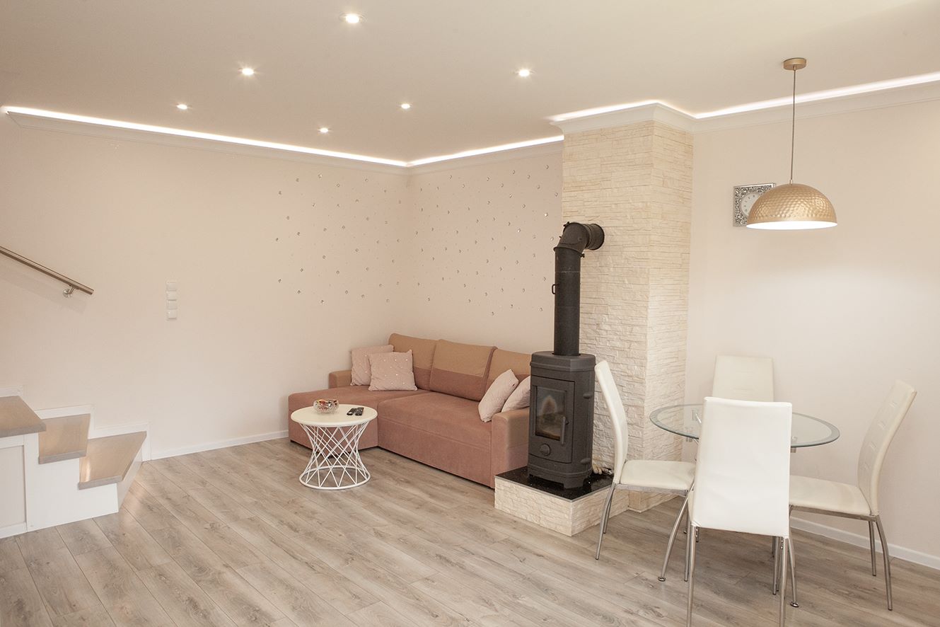 - Salon - Jasny salon pełen kryształowych akcentów daje poczucie lekkości i prestiżu. Komfortowa przestrzeń dziennego wypoczynku dla całej rodziny z rozkładanym narożnikiem z funkcją spania Poza tym kominek, który zapewnia ciepło i przytulną atmosferę w chłodniejsze wieczory.